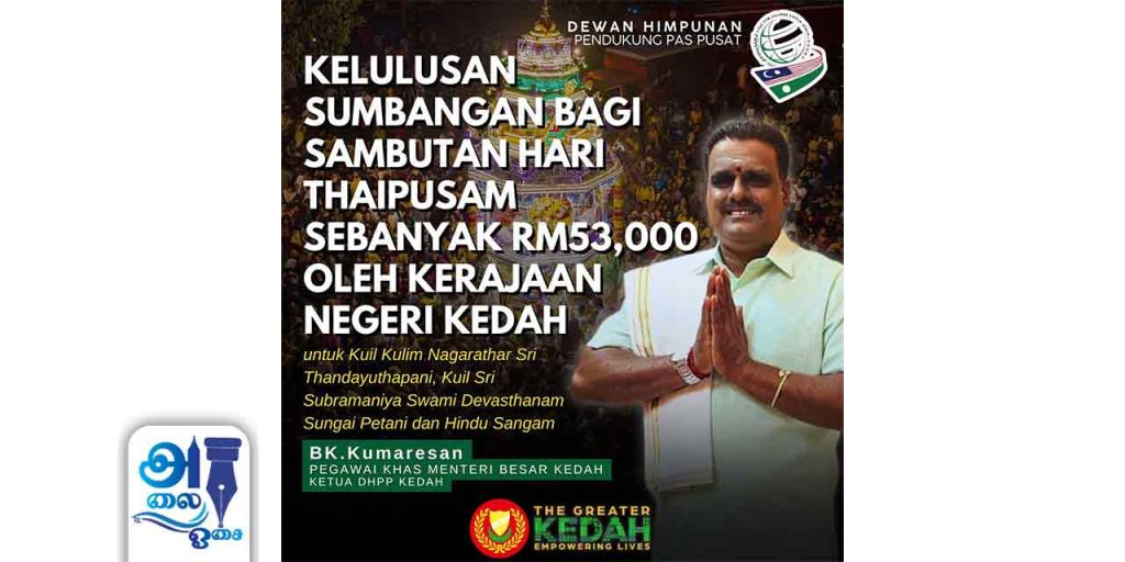 எதிர்வரும் தைப்பூச கொண்டாட்டத்தை முன்னிட்டு பாஸ் தலைமையிலான கெடா மாநில அரசாங்கம் வெ 53,000 நிதியுதவியை அறிவித்துள்ளது.