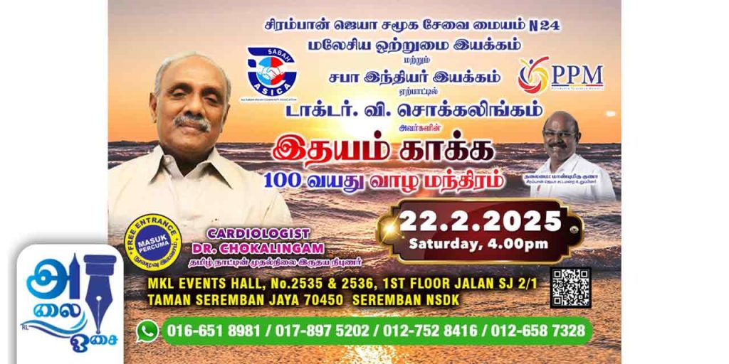இந்த நிலையில் சிரம்பான் ஜெயா சமூக சேவை மையம், மலேசிய ஒற்றுமை இயக்கம் மற்றும் சபா இந்தியர் இயக்கம் ஏற்பாட்டில் வரும் 22 பிப்ரவரி 2025 சனிக்கிழமை தாமான் சிரம்பான் ஜெயாவில் டாக்டர் சொக்கலிங்கம் உரை நிகழ்த்தவிருக்கிறார்.