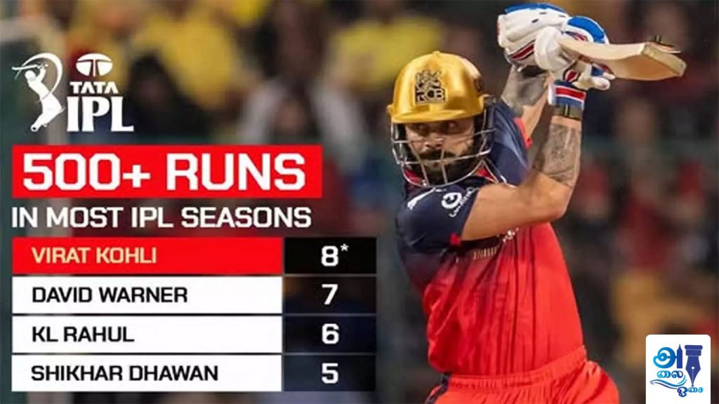 இதுவரை 8 சீசன்களில் 500 ரன்களுக்கும் மேல் கோலி அடித்துள்ளார். கோலிக்கு அடுத்தபடியாக வார்னர் 7 முறையும் கே.எல்.ராகுல் 6 முறையும் தவான் 5 முறையும் 500 ரன்களுக்கும் மேல் அடித்துள்ளனர். ஐபிஎல் வரலாற்றில் விராட் கோலி இதுவரை 263 போட்டிகளில் விளையாடி 8 சதம், 62 அரைசதம் உள்பட 8,509 ரன்கள் எடுத்துள்ளார். இவருக்கு அடுத்த இரு இடங்களில் ரோகித் சர்மா 267 போட்டிகளில் விளையாடி 6,921 ரன்னும், ஷிகர் தவான் 222 போட்டிகளில் விளையாடி 6,769 ரன்னும் எடுத்துள்ளனர்.