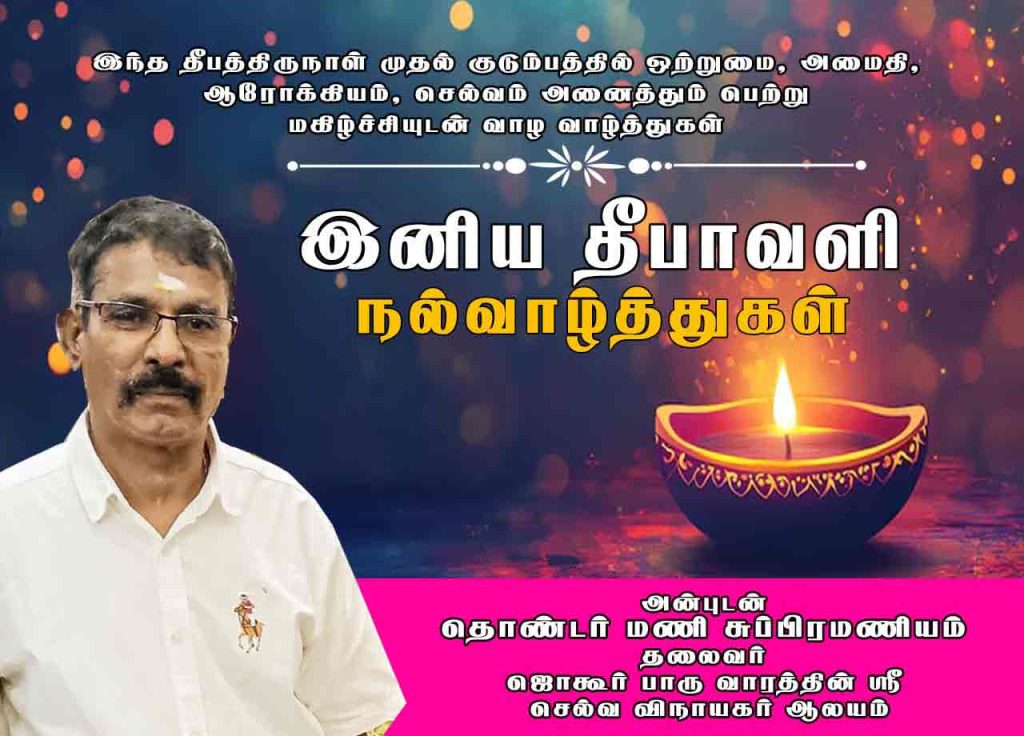Malaysia தொண்டர் மணி சுப்பிரமணியத்தின் தீபாவளி வாழ்த்துகள் By admin October 17, 2025 0 197 Share FacebookTwitterPinterestWhatsApp Share FacebookTwitterPinterestWhatsApp Previous articleதாஷா வெள்ளசாமியின் தீபாவளி வாழ்த்துகள்Next articleசுரேஷ் குருசாமியின் தீபாவளி வாழ்த்துகள் adminhttps://alaiosai.com.my RELATED ARTICLES Malaysia மலேசிய தடகள தலைமை பொறுப்பிலிருந்து காரீம் விலக வேண்டும்! April 17, 2026 Malaysia கூட்டரசு பிரதேச விளையாட்டு மன்றத்துடன் தடகள சங்கம் சந்திப்பு! April 17, 2026 Malaysia தப்பி ஓடியவரை கண்டுபிடித்தால் வெ5,000 சன்மானம் வழங்குகிறார் கெப்போங் எம்பி April 17, 2026 LEAVE A REPLY Cancel reply Comment: Please enter your comment! Name:* Please enter your name here Email:* You have entered an incorrect email address! Please enter your email address here Website: Save my name, email, and website in this browser for the next time I comment. Most Popular தமிழ்நாடு தேர்தல் என்பது இந்தியாவின் உலகளாவிய மரியாதைக்கான ஒரு சோதனையும் ஆகும்! April 19, 2026 மலேசிய தடகள தலைமை பொறுப்பிலிருந்து காரீம் விலக வேண்டும்! April 17, 2026 கூட்டரசு பிரதேச விளையாட்டு மன்றத்துடன் தடகள சங்கம் சந்திப்பு! April 17, 2026 தப்பி ஓடியவரை கண்டுபிடித்தால் வெ5,000 சன்மானம் வழங்குகிறார் கெப்போங் எம்பி April 17, 2026 Load more