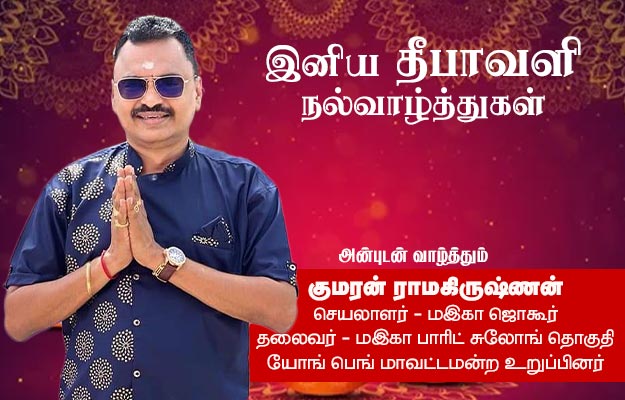 Malaysia குமரன் ராமகிருஷ்ணன் அவர்களின் இனிய தீபாவளி நல்வாழ்த்துகள் By admin October 18, 2025 0 64 Share FacebookTwitterPinterestWhatsApp Share FacebookTwitterPinterestWhatsApp Previous articleஏர் ஆசியா பணியாளர்களின் தீபாவளி வாழ்த்துக்கள்!Next articleநவநீத கிருஷ்ணன் ரத்தினம் அவர்களின் இனிய தீபாவளி நல்வாழ்த்துகள் adminhttps://alaiosai.com.my RELATED ARTICLES Malaysia மலேசிய தடகள தலைமை பொறுப்பிலிருந்து காரீம் விலக வேண்டும்! April 17, 2026 Malaysia கூட்டரசு பிரதேச விளையாட்டு மன்றத்துடன் தடகள சங்கம் சந்திப்பு! April 17, 2026 Malaysia தப்பி ஓடியவரை கண்டுபிடித்தால் வெ5,000 சன்மானம் வழங்குகிறார் கெப்போங் எம்பி April 17, 2026 LEAVE A REPLY Cancel reply Comment: Please enter your comment! Name:* Please enter your name here Email:* You have entered an incorrect email address! Please enter your email address here Website: Save my name, email, and website in this browser for the next time I comment. Most Popular மலேசிய தடகள தலைமை பொறுப்பிலிருந்து காரீம் விலக வேண்டும்! April 17, 2026 கூட்டரசு பிரதேச விளையாட்டு மன்றத்துடன் தடகள சங்கம் சந்திப்பு! April 17, 2026 தப்பி ஓடியவரை கண்டுபிடித்தால் வெ5,000 சன்மானம் வழங்குகிறார் கெப்போங் எம்பி April 17, 2026 மலேசிய தடகளத்தில் ஒரு மகளின் சர்ச்சைக்குரிய பங்கு! April 16, 2026 Load more