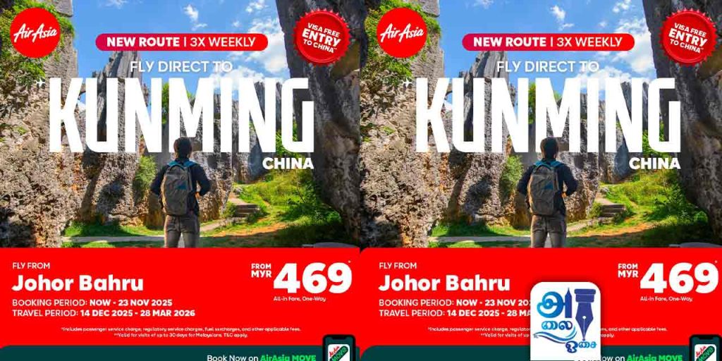 ‘வசந்த நகரம்’ என புகழுடன் அழைக்கப்படும் குன்மிங் நகருக்கு வாரத்திற்கு 3 விமான சேவைகளை எதிர் வரும் 14 டிசம்பர் 2025 முதல் ஏர் ஆசியா மேற்கொள்ள விற்கிறது.