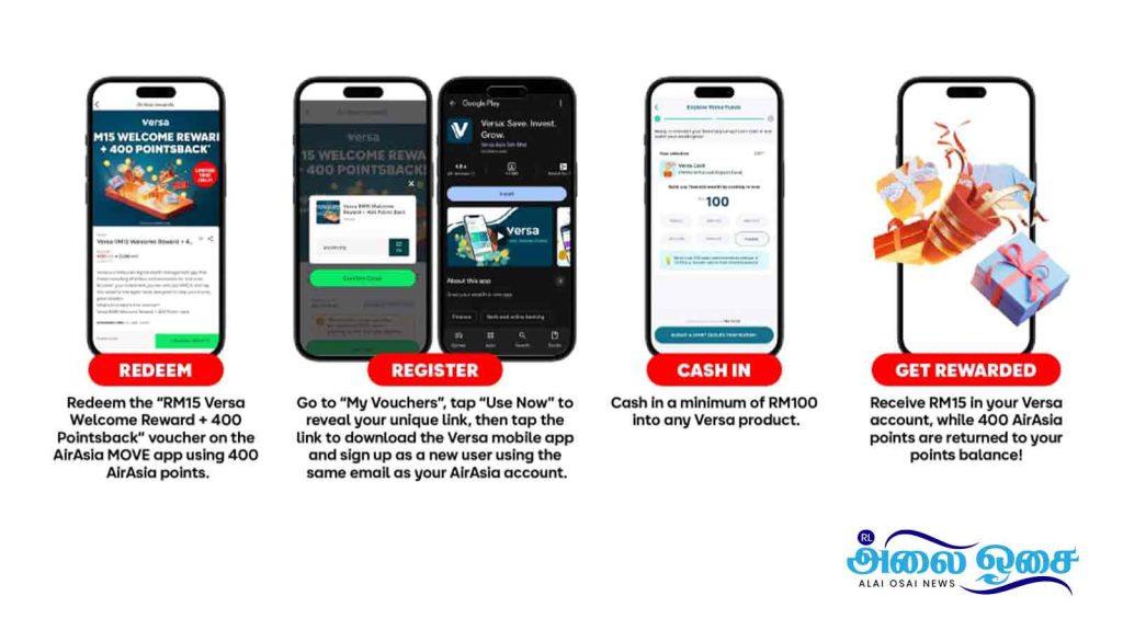 இதன்வழி Versa மூலம் பெறப்படும் ஏர் ஆசியா புள்ளிகளை AirAsia MOVE செயலியின் வழியாக விமான பயணங்கள், ஹோட்டல் தங்குமிடங்கள் மற்றும் பலவற்றிற்காக பயன்படுத்திக் கொள்ளலாம்.