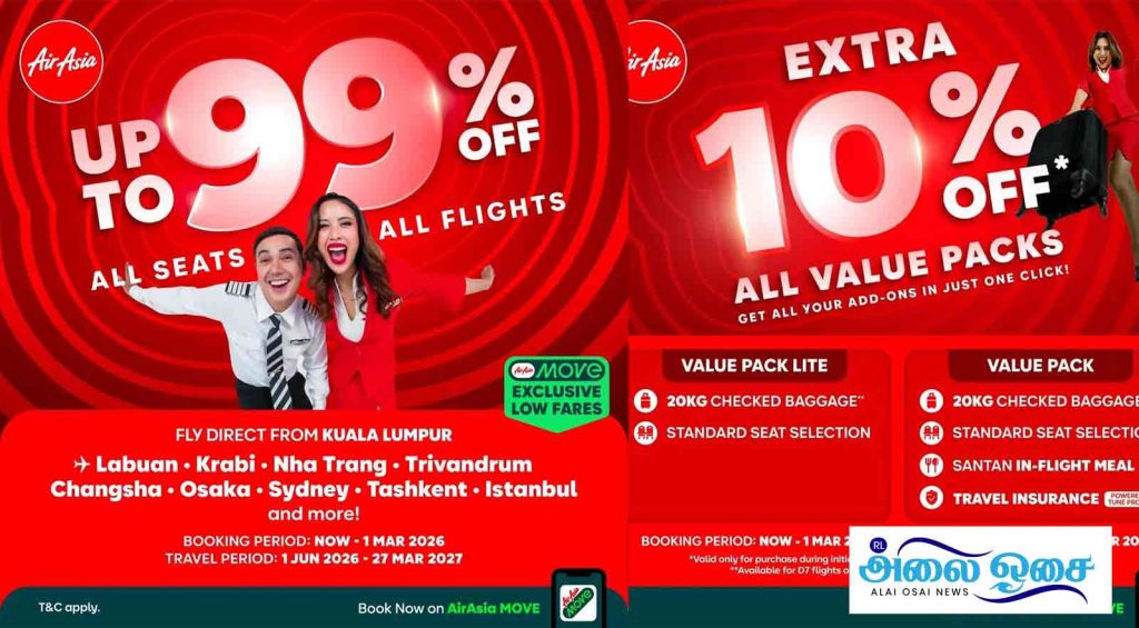 1 ஜூன் 2026 முதல் 27 மார்ச் 2027 வரையிலான பயணத்திற்கு airasia.com அல்லது AirAsia MOVE செயலியின் வழி இந்த சிறப்பு கட்டணத்திற்கான டிக்கெட்டுகளை பதிவிறக்கம் செய்து கொள்ளலாம்.