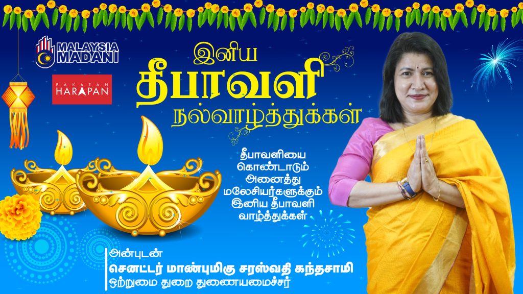 இந்த இந்த தீபத் திருநாளை நாம் அனைவரும் மகிழ்ச்சியுடன் மற்றும் ஒற்றுமையுடன் கொண்டாட வேண்டும் என தேசிய ஒற்றுமை துறை துணையமைச்சர் செனட்டர் சரஸ்வதி கந்தசாமி தமது தீபாவளி வாழ்த்து செய்தியில் கேட்டுக்கொண்டார்.